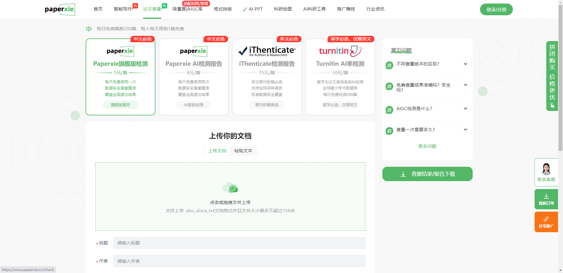 上传门槛也很低,支持.doc/.docx/.txt 格式,最大不超过 15MB,绝大多数毕业论文、课程论文都能直接上传,不用拆分文件。平台还设置了每日免费篇数,每人每天有 1 篇免费额度,初稿可以先用免费额度测一遍,再按需升级。